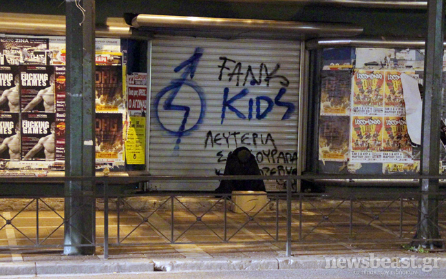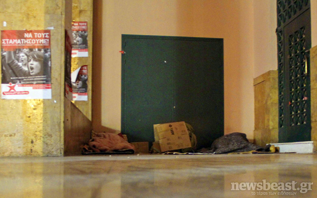 Στην ίδια την είσοδο της Νομικής σχολής, εκεί που σχεδόν δύο μήνες πριν, μία ολόκληρη χώρα ξενυχτούσε προκειμένου να βρούνε νέα στέγη οι 300 μετανάστες απεργοί πείνας, δύο άστεγοι έχουν φτιάξει τα καταλύματα τους. Γι’ αυτούς καμία πολιτική παράταξη δεν νοιάζεται. Καμία επιτροπή αλληλεγγύης δεν είναι εκεί για να τους προσέχει ενώ τα φλας και οι προβολείς των ΜΜΕ δεν ανάβουν γι αυτούς.