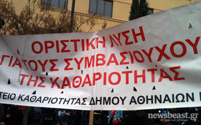 Συγκέντρωση διαμαρτυρίας στην πλατεία Κοτζιά πραγματοποιούν αυτή την ώρα συμβασιούχοι που απασχολούνται στον τομέα καθαριότητας του Δήμου Αθηναίων.
