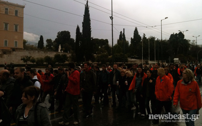Κρατώντας πανό και φωνάζοντας συνθήματα οι περίπου 300 συγκεντρωμένοι ζητούν τη μονιμοποίησή τους.
