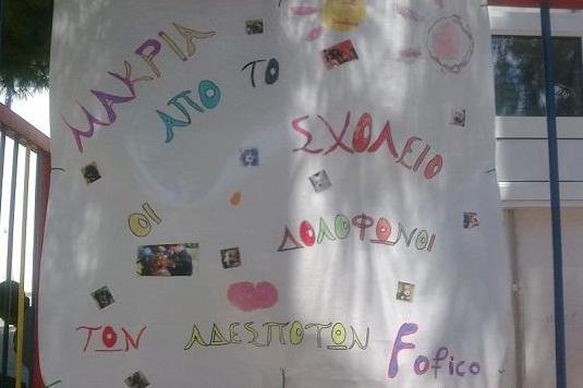 Τα παιδιά κόλλησαν στα κάγκελα του σχολείου τους χαρτόνια με τα ονόματα των ζώων που θρηνούν και με συνθήματα όπως Η ΕΡΕΤΡΙΑ ΑΝΗΚΕΙ ΣΕ ΟΛΟΥΣ, ΜΑΚΡΙΑ ΑΠΟ ΤΟ ΣΧΟΛΕΙΟ ΟΙ ΔΟΛΟΦΟΝΟΙ ΑΔΕΣΠΟΤΩΝ και Η ΔΗΛΗΤΗΡΙΑΣΗ ΕΙΝΑΙ ΕΓΚΛΗΜΑ – ΟΙ ΕΓΚΛΗΜΑΤΙΕΣ ΣΤΗ ΦΥΛΑΚΗ έδωσαν το δικό τους μήνυμα στους δράστες που σίγουρα θα περάσουν και πάλι από το σημείο.