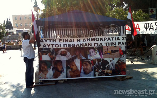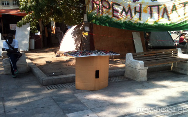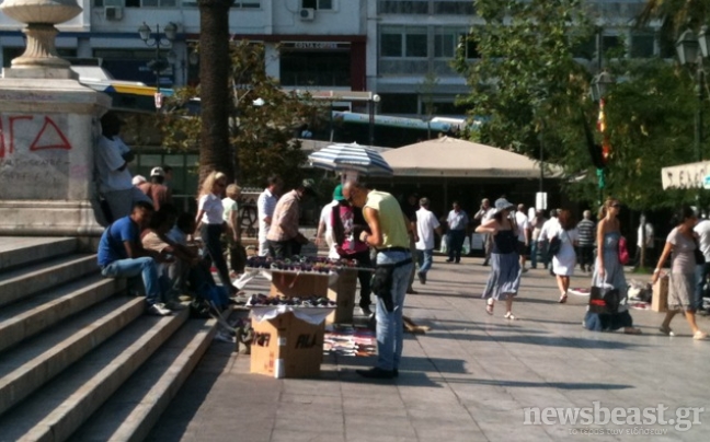 Έξω από το μετρό Συντάγματος πλανόδιοι μαύροι πουλούν τσάντες, γυαλιά ηλίου μέχρι και θήκες κινητών τηλεφώνων. Λίγα μέτρα μακριά, οι ελάχιστοι «Αγανακτισμένοι» που παραμένουν στην πλατεία, βρίσκονται μέσα στις σκηνές που έχουν στήσει από τις 26 Μαΐου, μία ημέρα μετά την επίσημη πρεμιέρα του κινήματος.