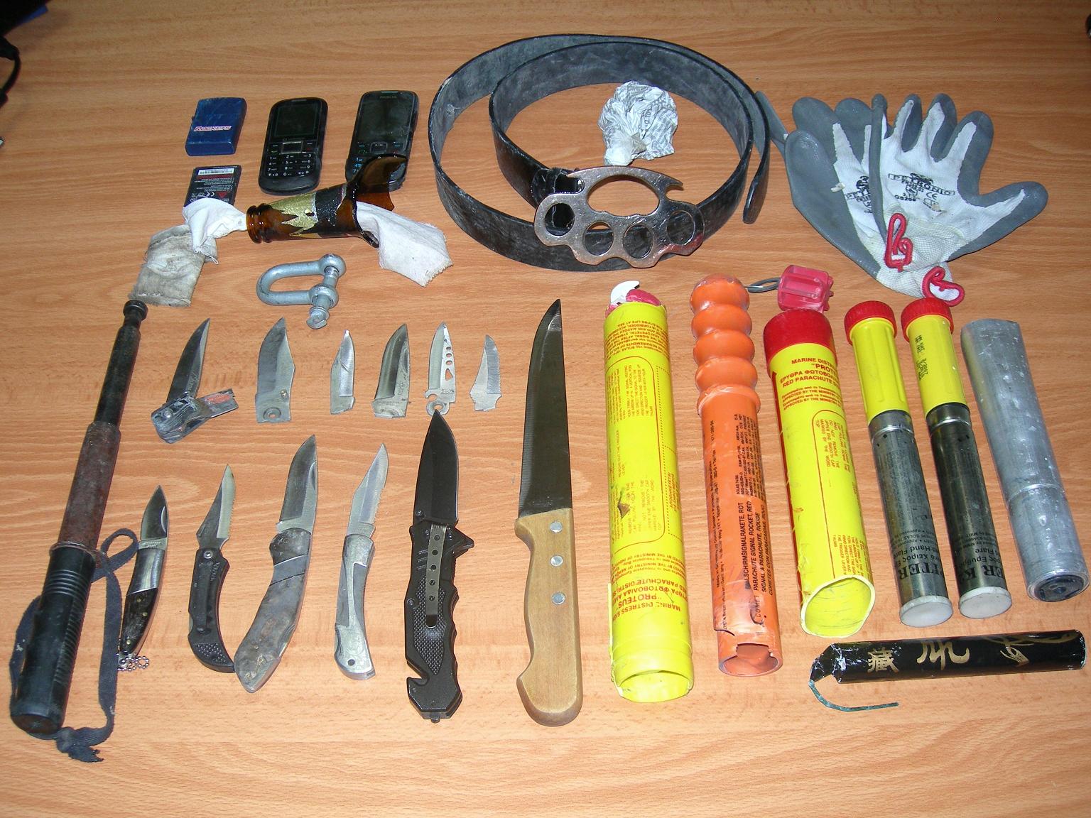 Στιλέτα, μολότοφ, καπνογόνα, πέτρες, ρόπαλα, λάμες, κουζινομάχαιρα, σουγιάδες, σιδερόβεργες και σιδερογροθιές βρέθηκαν στο σημείο που έγινε χτες το μπλόκο της αστυνομίας στον σταθμό «Ειρήνη» του ΗΣΑΠ, που είχαν επιλέξει ως χώρο για να συγκρουστούν χούλιγκανς του Ολυμπιακού και του Παναθηναϊκού.