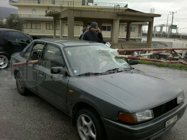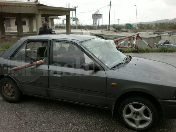 Λόγω των θυελλωδών ανέμων, η μπάρα έκλεισε με αποτέλεσμα να διαπεράσει, όπως φαίνεται από τις φωτογραφίες που δημοσιεύει το flashnews το αυτοκίνητο του 30χρονου ενώ αυτό κινούνταν, περνώντας από το μπαμπρίζ του οχήματος έξω από το πίσω δεξί παράθυρο.