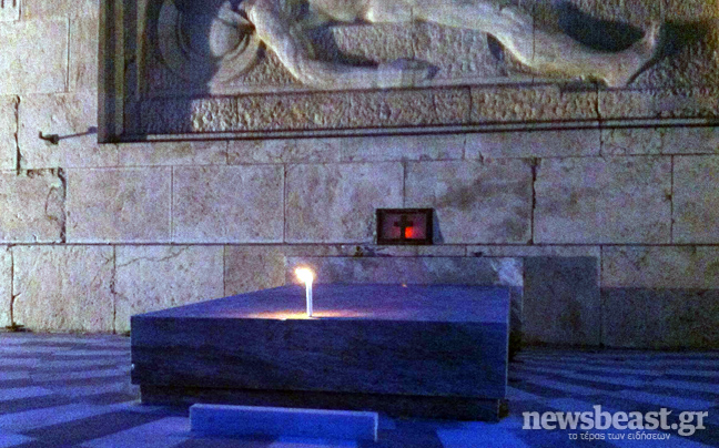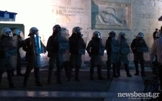Οι διαδηλωτές έχουν αφήσει ένα κερί στον Άγνωστο Στρατιώτη και ήδη τα ΜΑΤ κατεβαίνουν να προστατεύσουν το μνημείο.
