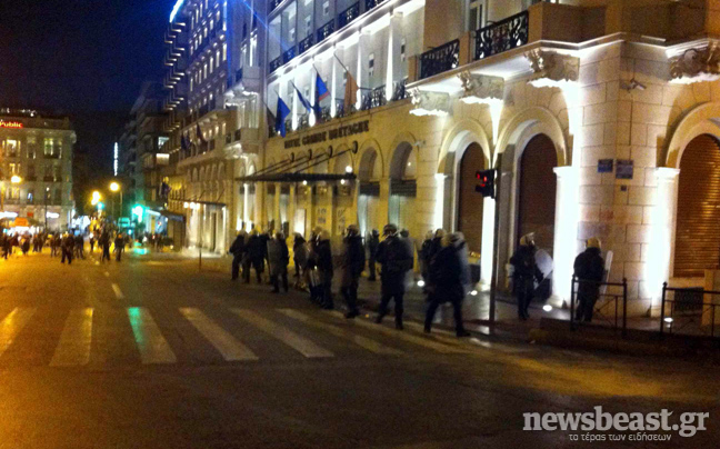Αυτή τη στιγμή βρίσκεται σε εξέλιξη κυνηγητό μπροστά στη Μεγάλη Βρετανία με δακρυγόνα και πέτρες, ενώ μερίδα των συγκεντρωμένων έκαναν υλικές ζημιές στο ξενοδοχείο.