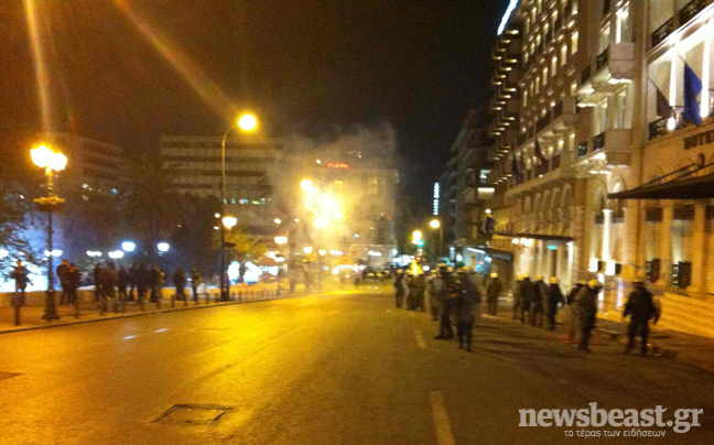Ένταση επικράτησε πάλι στο Σύνταγμα μπροστά από τη Βουλή. Όλα ξεκίνησαν όταν ένας από τους συγκεντρωμένους πέταξε μολότοφ στους αστυνομικούς, οι οποίοι απάντησαν με ρίψη χημικών.