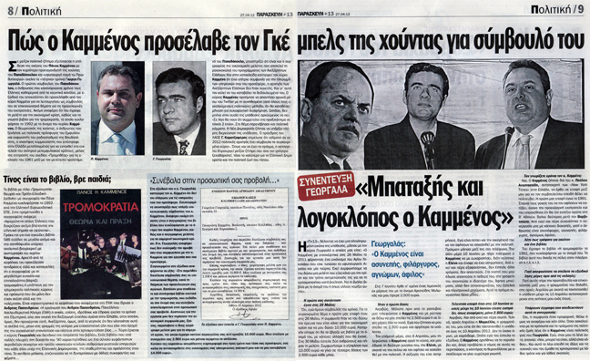 Το επίμαχο δισέλιδο της εφημερίδας «Παρασκευή και 13», που δημοσιεύθηκε οκτώ ώρες πριν τη σύλληψη του εκδότη της, Αιμίλιου Λιάτσου, μετά τη μήνυση που υπέβαλε η σύζυγος του Πάνου Καμμένου, Έλενα Τζούλη, φέρει τον τίτλο «Πώς ο Καμμένος προσέλαβε τον Γκέμπελς για σύμβουλό του».