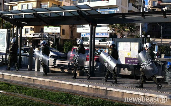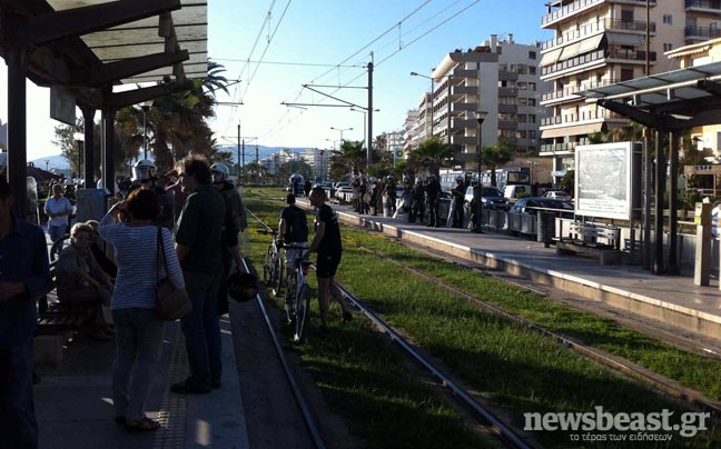 Στην περιοχή βρίσκεται πλήθος αστυνομικών, ενώ τα ΜΑΤ έχουν παραταχθεί δίπλα στη στάση του τραμ, δημιουργώντας μία διαχωριστική γραμμή μεταξύ συγκέντρωσης και κατοίκων.
