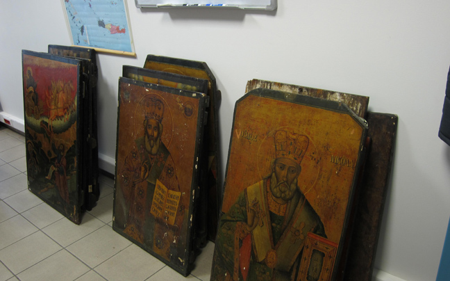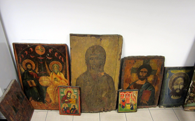 Στην έρευνα που έκανε η αστυνομία στα σπίτια, στα δύο καταστήματα πώλησης εκκλησιαστικών ειδών και σε αποθήκη του συλληφθέντα στις περιοχές της Περαίας και του κέντρου της Θεσσαλονίκης, βρέθηκαν και κατασχέθηκαν: