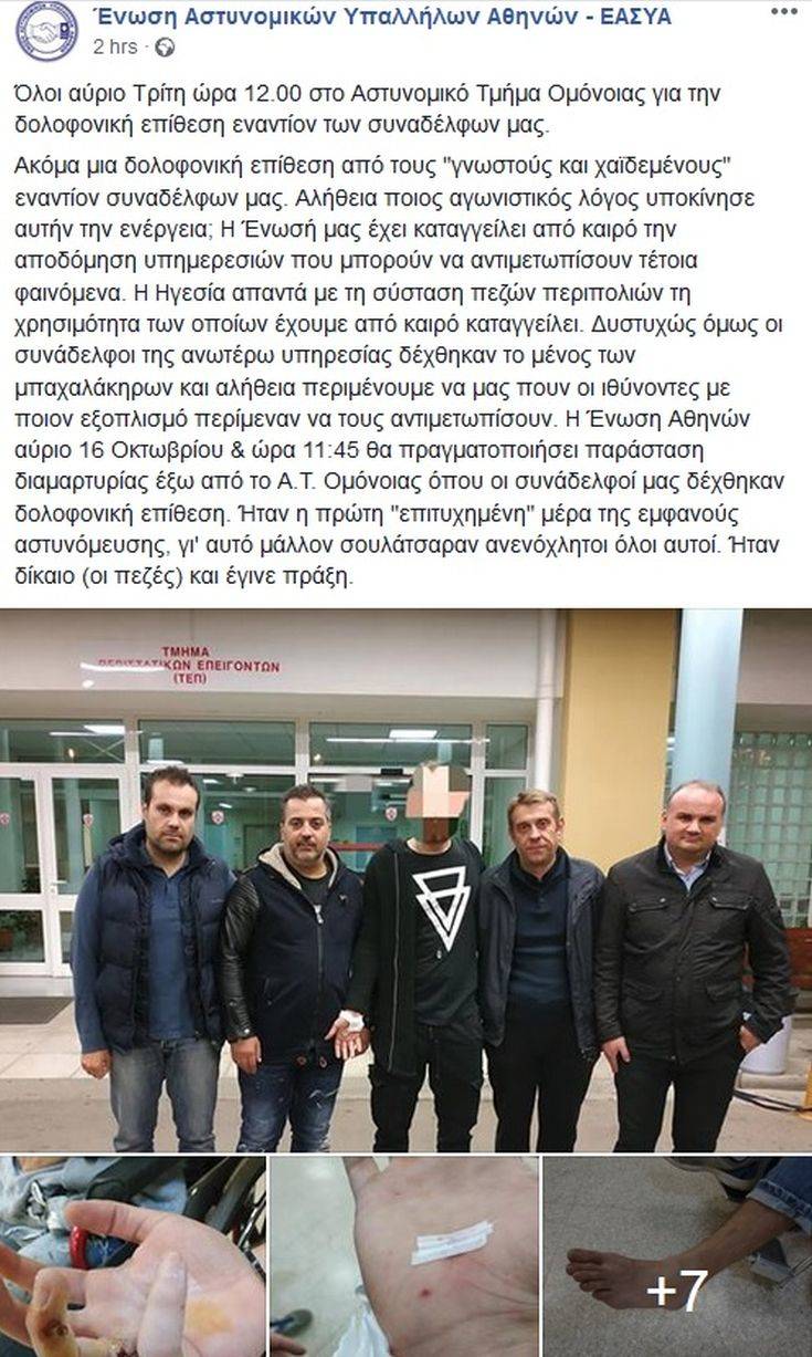Στη σελίδα της Ένωσης στο facebook, μάλιστα, δημοσιεύθηκαν και φωτογραφίες των τραυματισμένων αστυνομικών μέσα αλλά και έξω από το 401 όπου μεταφέρθηκαν προκειμένου να τους παρασχεθούν οι πρώτες βοήθειες.