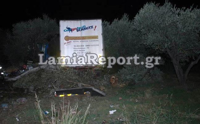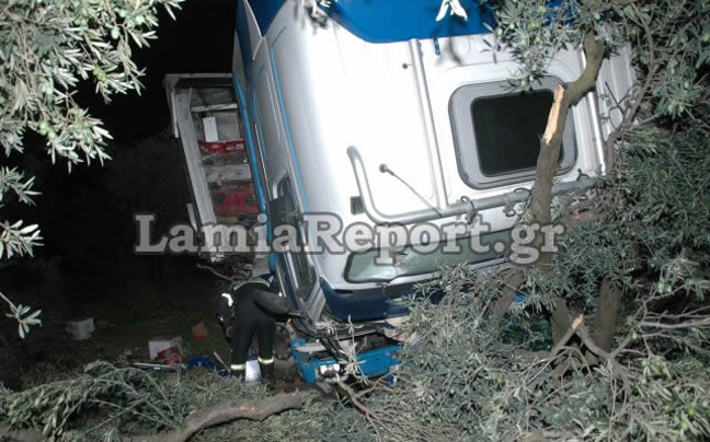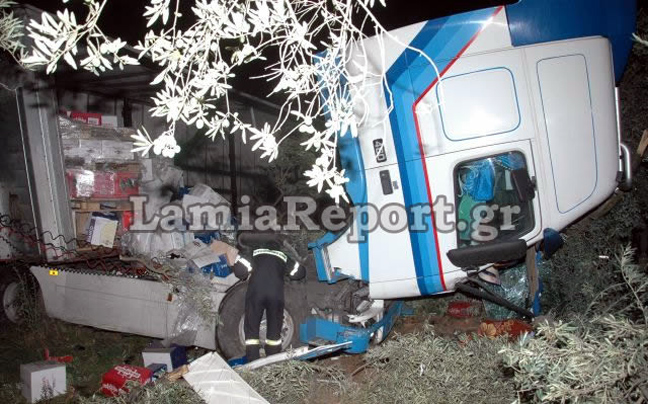 Ο οδηγός της νταλίκας προσπάθησε να αποφύγει τη ρεζέρβα, αλλά δεν τα κατάφερε με αποτέλεσμα να τραυματιστεί ελαφρά κατά την πτώση του οχήματος μέσα στα χωράφια, σύμφωνα με το lamiareport.gr.
