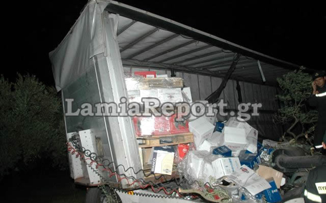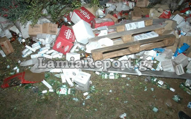 Ο οδηγός διακομίσθηκε με ασθενοφόρο του ΕΚΑΒ στο νοσοκομείο της Λαμίας, ενώ τα χωράφια γέμισαν με μπουκάλια από αλκοολούχα ποτά που μετέφερε μέσα σε κιβώτια και παλέτες η νταλίκα.
