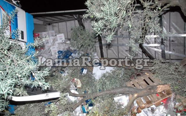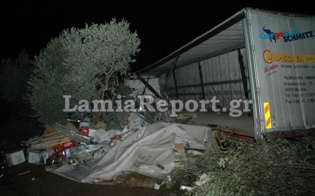 Πάνω σε μια ρεζέρβα που έφυγε από ένα φορτηγό έπεσε μια νταλίκα στο 222ο χιλιόμετρο, λίγο έξω από τη Στυλίδα, με αποτέλεσμα το τεράστιο όχημα να τουμπάρει μέσα σε ελιές.