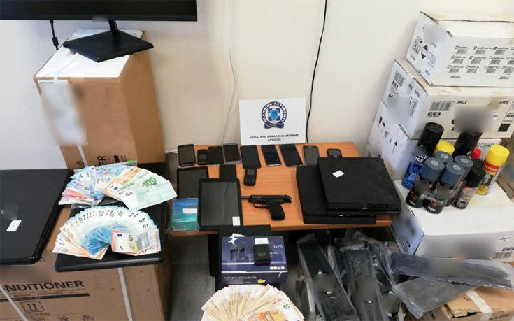 Από τις αστυνομικές έρευνες που διενεργήθηκαν σε οικίες και γραφεία βρέθηκαν και κατασχέθηκαν, μεταξύ άλλων: Τρία αυτοκίνητα, τράκτορας, ζεύγος πλαστών πινακίδων κυκλοφορίας, δύο «εγκέφαλοι» οχημάτων, δύο πιστόλια, 24 φυσίγγια, σιδερογροθιά, μαχαίρι κυνηγετικού τύπου με θήκη, τo χρηματικό ποσό των 49.272 ευρώ, δύο συστήματα δορυφορικού εντοπισμού (GPS), καθώς και πλήθος ηλεκτρονικών συσκευών και τιμαλφών, έγγραφα, τιμολόγια, μπλοκ επιταγών, βιβλιάρια καταθέσεων, τραπεζικά έγγραφα και σφραγίδες διαφόρων εταιρειών.