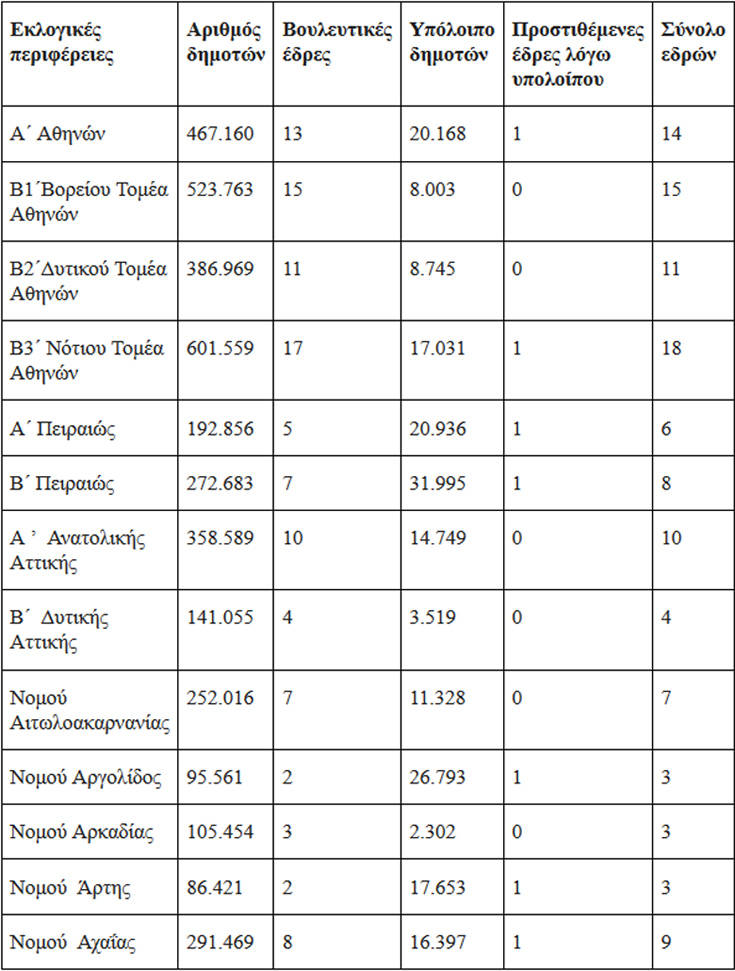 Η μία έδρα της Αττικής… μεταφέρεται στο νομό Αχαΐας και οι έδρες του από 8 γίνονται 9, ενώ οι προστιθέμενες έδρες λόγω υπολοίπου στην Αχαΐα από μηδενικές γίνεται μία.