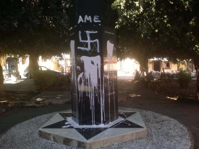Άγνωστοι βεβήλωσαν το μνημείο ολοκαυτώματος των Εβραίων που βρίσκεται στην Παλιά Πόλη της Ρόδου, βάφοντάς το με λευκή μπογιά, ζωγραφίζοντας επάνω σβάστικες και γράφοντας τα αρχικά «ΑΜΕ».