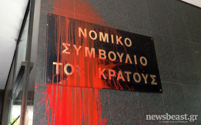 Καταδρομική επίθεση πραγματοποίησε ομάδα νεαρών στις 12:30 το μεσημέρι, στο Νομικό Συμβούλιο του Κράτους, στη συμβολή των οδών Ακαδημίας και Ζωοδόχου Πηγής.