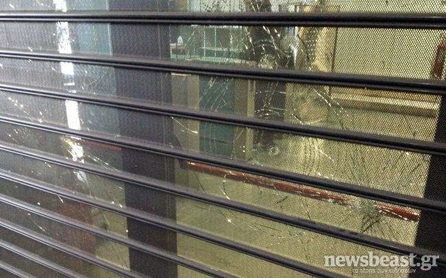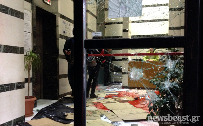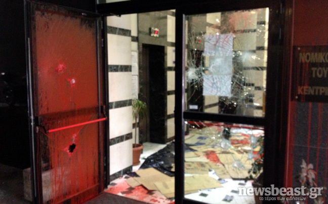 Οι νεαροί πέταξαν πέτρες, φυλλάδια «τιμής» στον αναρχικό Λάμπρο Φούντα και άλλα αντικείμενα, σπάζοντας την τζαμαρία της εισόδου και στη συνέχεια άδειασαν κουβάδες με μπογιές.