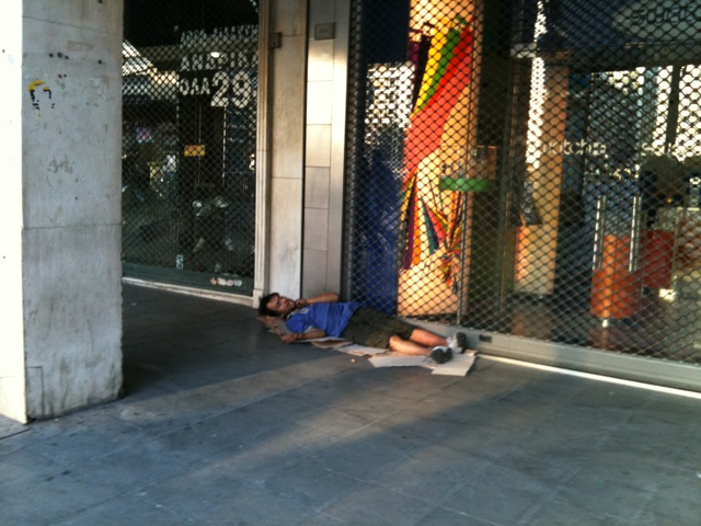 Ακριβώς απέναντι, μπροστά από ένα μαγαζί που πουλάει ρολόγια αλλά λόγω της ώρας είναι κλειστό, ένας άλλος χρήστης ναρκωτικών ουσιών έχει τοποθετήσει στο βρώμικο πεζοδρόμιο τέσσερα λεπτά χαρτόκουτα για να κοιμηθεί.