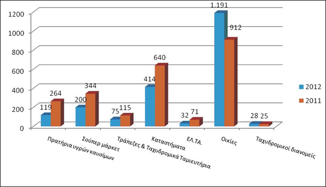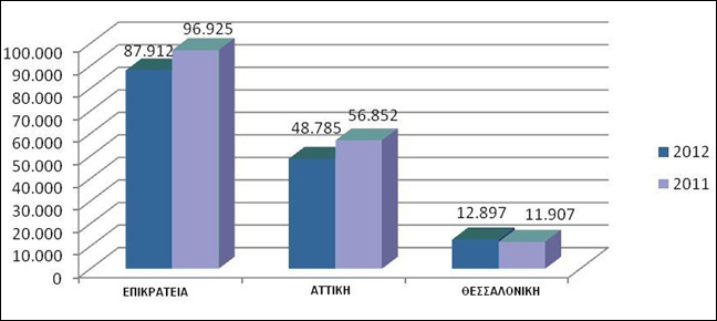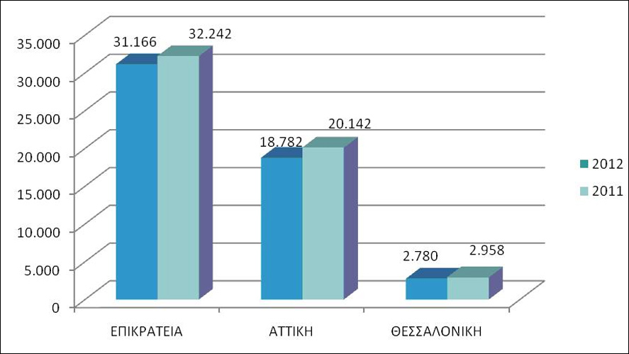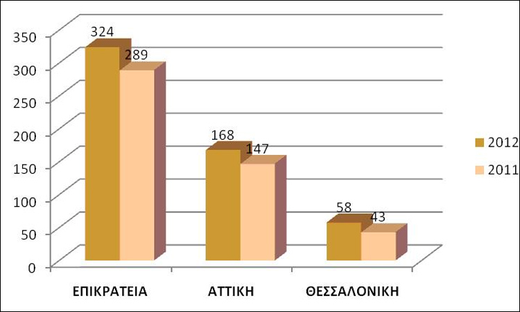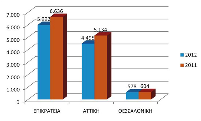 Συγκεκριμένα, σε επίπεδο Επικράτειας καθώς και στις πόλεις της Αθήνας και Θεσσαλονίκης, όπου παρατηρείται ο κύρος όγκος των ληστειών, στη σύγκριση του 2012 με το 2011, καταγράφονται: