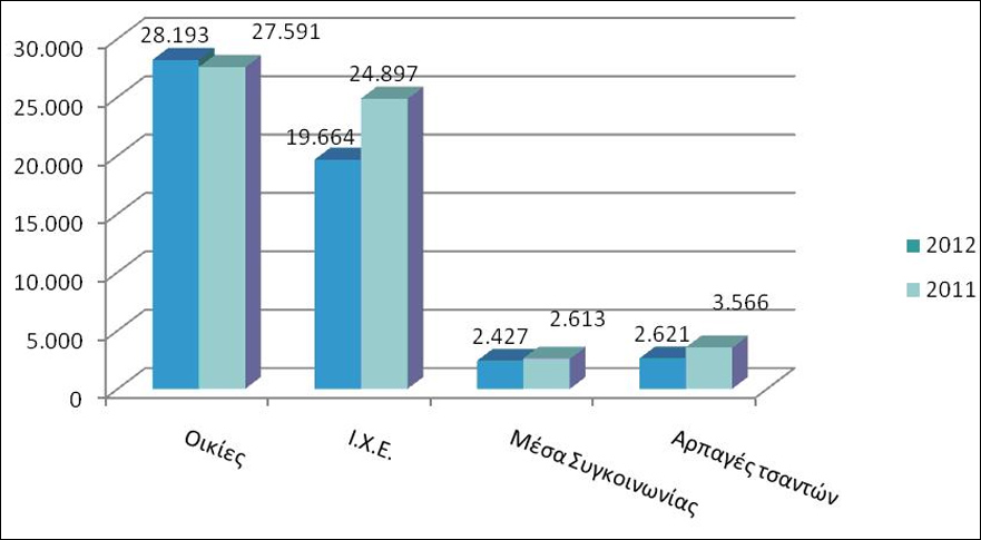Συγκεκριμένα, σε επίπεδο επικράτειας, καθώς και στις πόλεις της Αθήνας και Θεσσαλονίκης όπου καταγράφεται ο κύρος όγκος των κλοπών και των διαρρήξεων, στη σύγκριση του έτους 2012 σε σχέση με το έτος 2011, καταγράφονται τα εξής :