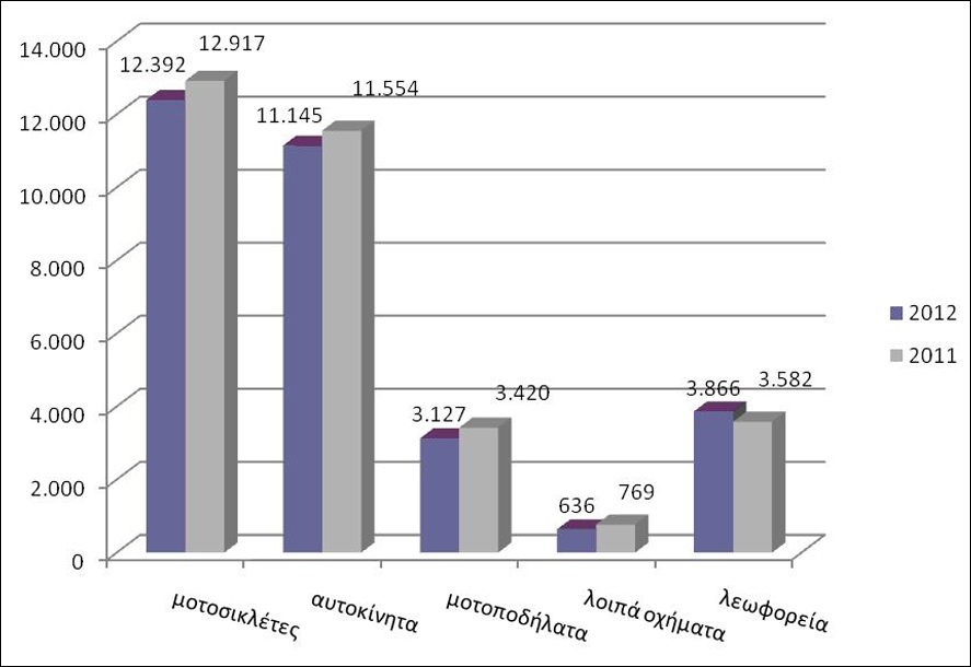 Συγκεκριμένα, σε επίπεδο επικράτειας, καθώς και στις πόλεις της Αθήνας και Θεσσαλονίκης όπου καταγράφεται ο κύριος όγκος των κλοπών τροχοφόρων, στη σύγκριση του έτους 2012 σε σχέση με το έτος 2011, καταγράφονται τα εξής: