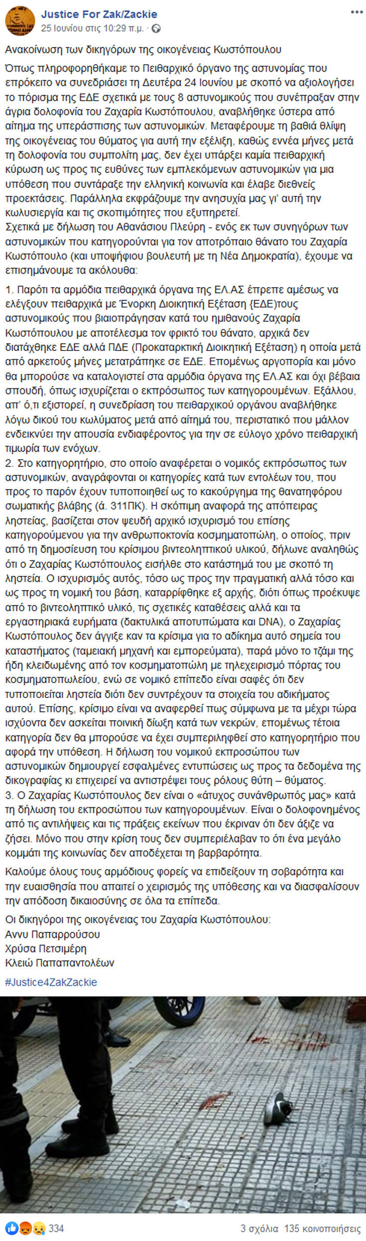 Όπως πληροφορηθήκαμε το Πειθαρχικό όργανο της αστυνομίας που επρόκειτο να συνεδριάσει τη Δευτέρα 24 Ιουνίου με σκοπό να αξιολογήσει το πόρισμα της ΕΔΕ σχετικά με τους 8 αστυνομικούς που συνέπραξαν στην άγρια δολοφονία του Ζαχαρία Κωστόπουλου, αναβλήθηκε ύστερα από αίτημα της υπεράσπισης των αστυνομικών. Μεταφέρουμε τη βαθιά θλίψη της οικογένειας του θύματος για αυτή την εξέλιξη, καθώς εννέα μήνες μετά τη δολοφονία του συμπολίτη μας, δεν έχει υπάρξει καμία πειθαρχική κύρωση ως προς τις ευθύνες των εμπλεκόμενων αστυνομικών για μια υπόθεση που συντάραξε την ελληνική κοινωνία και έλαβε διεθνείς προεκτάσεις. Παράλληλα εκφράζουμε την ανησυχία μας γι’ αυτή την κωλυσιεργία και τις σκοπιμότητες που εξυπηρετεί.