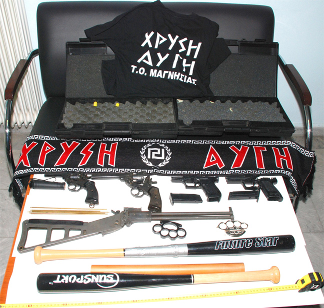 – στην οικία του 17χρονου: μία σιδερογροθιά, ένα ξύλινο ρόπαλο τύπου baseball, ένα κασκόλ και μία μπλούζα με λογότυπο πολιτικού κόμματος, δύο απομιμήσεις πιστολιών (replica) με γεμιστήρες