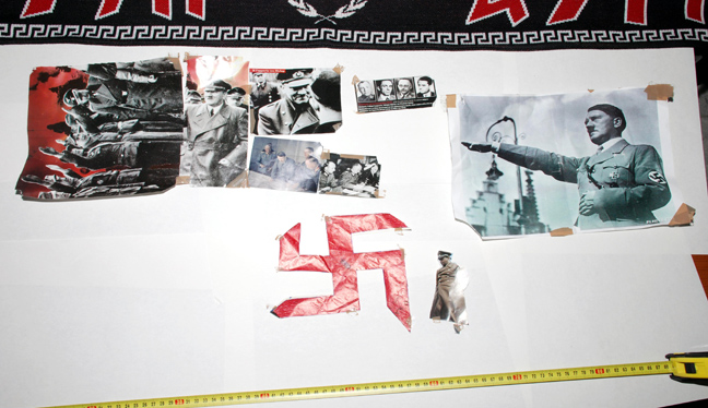 Προηγήθηκε χθες τόσο η σύλληψή τους όσο και των γονιών του ανήλικου αλλά και η έρευνα στα σπίτια τους, κατά την οποία οι αστυνομικοί ανακάλυψαν στις τρεις οικίες ένα ολόκληρο οπλοστάσιο, αποτελούμενο από όπλα (περίστροφα, απομιμήσεις πιστολιών (replica) με γεμιστήρες, μεταλλικές βέργες καθαρισμού πιστολιού, ξύλινο ρόπαλο, σιδερογροθιά, κουκούλα (full face) καθώς και εμβλήματα της Χρυσής Αυγής (κασκόλ, μπλούζα) και ναζιστικά (αγκυλωτός σταυρός) ακόμα και αφίσα του Αδόλφου Χίτλερ.