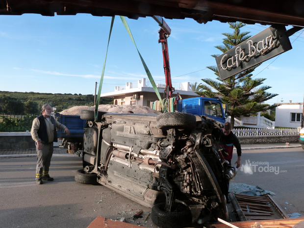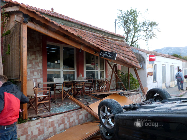 Σκηνές από ταινία δράσης θυμίζουν οι εικόνες που αντίκρισαν τα ξημερώματα του Σαββάτου οι κάτοικοι στα Περατάτα Κεφαλλονιάς, όταν αυτοκίνητο που παρεξέκλινε της πορείας του, έπεσε πάνω σε καφετέρια και προξένησε σοβαρές υλικές ζημιές.