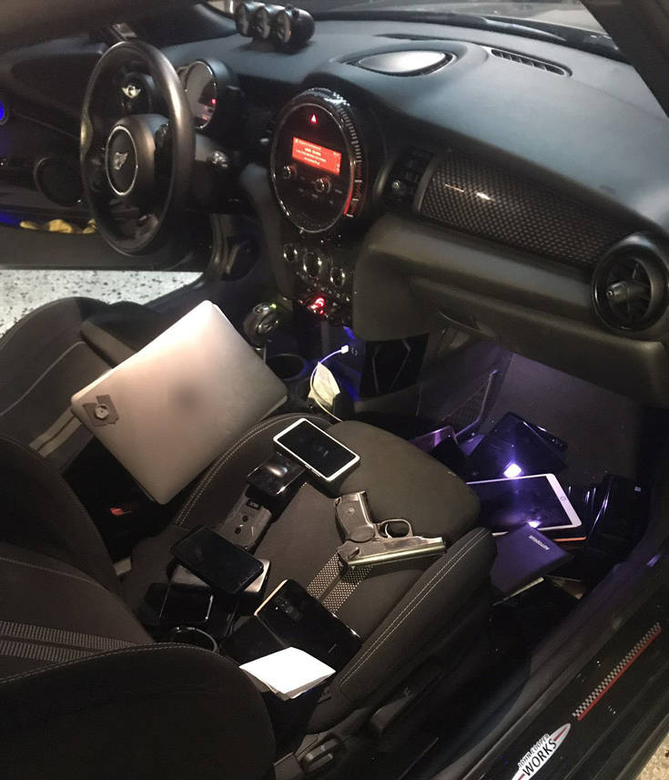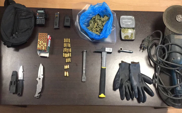 Στην κατοχή του, καθώς και στο σπίτι του, βρέθηκαν και κατασχέθηκαν κινητά τηλέφωνα, φορητοί υπολογιστές, ένα πιστόλι, 83 φυσίγγια, ένα ασύρματος, αλλά και 49,5 γραμμάρια κάνναβης.