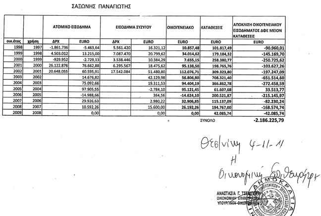 Δέχθηκε μεταξύ άλλων στην κατοχή του και έγινε δικαιούχος: α) συνολικού ποσού 145.169,70 ευρώ – όσο ακριβώς λέει και το πόρισμα της Οικονομικής Επιθεωρήτριας – κατά την διάρκεια του έτους 1998»!!!