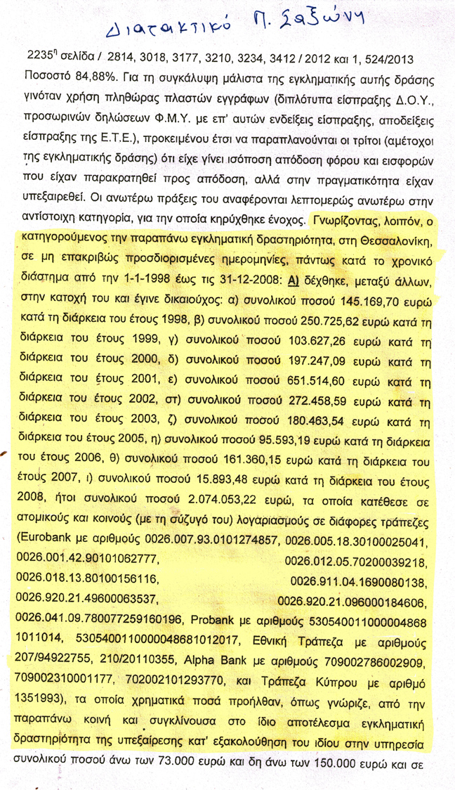 Συγκεκριμένα στη σελίδα 2235 της ΑΠΟΦΑΣΗΣ, την οποίαν επίσης δίνω στην δημοσιότητα –στο «διατακτικό»-διαβάζω: «Γνωρίζοντας λοιπόν ο κατηγορούμενος – υπάλληλος του Δήμου – την παραπάνω εγκληματική δραστηριότητα, στην Θεσσαλονίκη, σε μη επακριβώς προσδιορισμένες ημερομηνίες, πάντως κατά το χρονικό διάστημα από την 1-1-1998 έως τις 31-12-2008 (δηλ. κατά το χρονικό διάστημα του κατηγορητηρίου): Α)