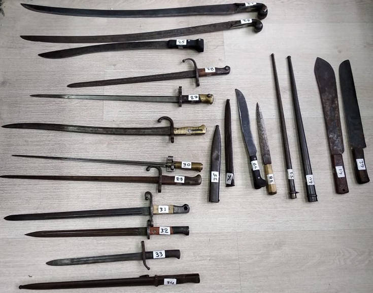 Μέσα στον ταξιδιωτικό σάκο βρέθηκαν 11 περίστροφα, 4 πυροβόλα όπλα χειρός μονής βολής, εμπροσθογεμές όπλο χειρός, δίκαννο με εξωτερικές σφύρες, ένα δίκαννο όπλο χειρός λειόκαννο με εξωτερικές σφύρες, 2 εμπροσθογεμή τρίκαννα όπλα χειρός μαύρης πυρίτιδας, εμπροσθογεμές εξάκαννο όπλο χειρός μαύρης πυρίτιδας, εμπροσθογεμές δίκαννο όπλο χειρός μαύρης πυρίτιδας, εμπροσθογεμές δίκαννο τύπου πιστόλας με εξωτερικές σφύρες, 3 σπαθιά, 9 ξιφολόγχες πολεμικών τυφεκίων, 4 θήκες ξιφολογχών, 2 ξιφίδια και 2 ματσέτες.