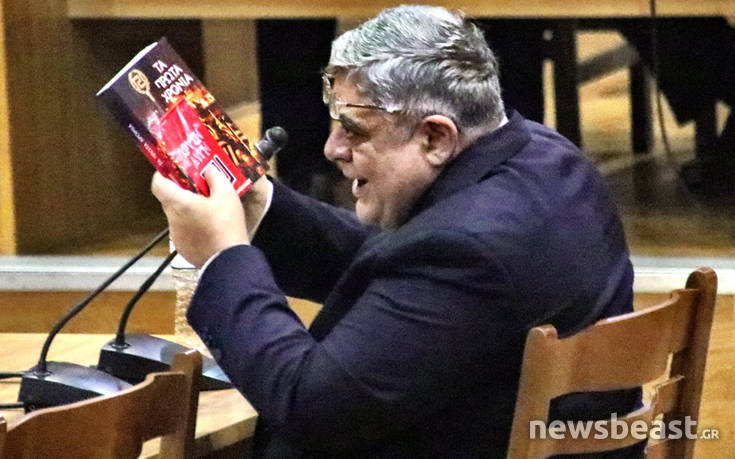 Το βιβλίο, που κάποιες στιγμές ξεφύλλιζε ο Μιχαλολιάκος, είναι το πρόσφατο δικό του βιβλίο, με τίτλο «Τα πρώτα χρόνια – Χρυσή Αυγή», το οποίο εκδόθηκε το 2017.