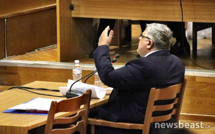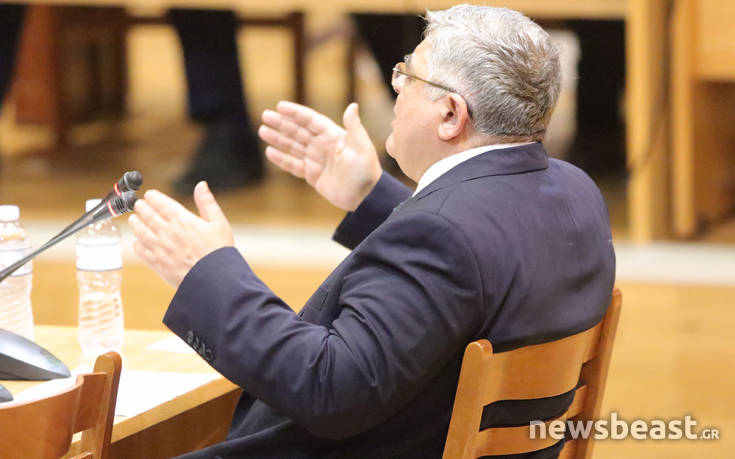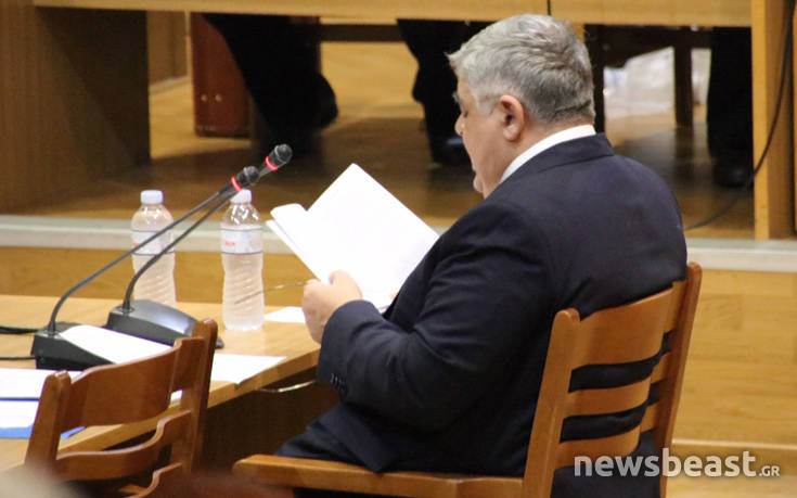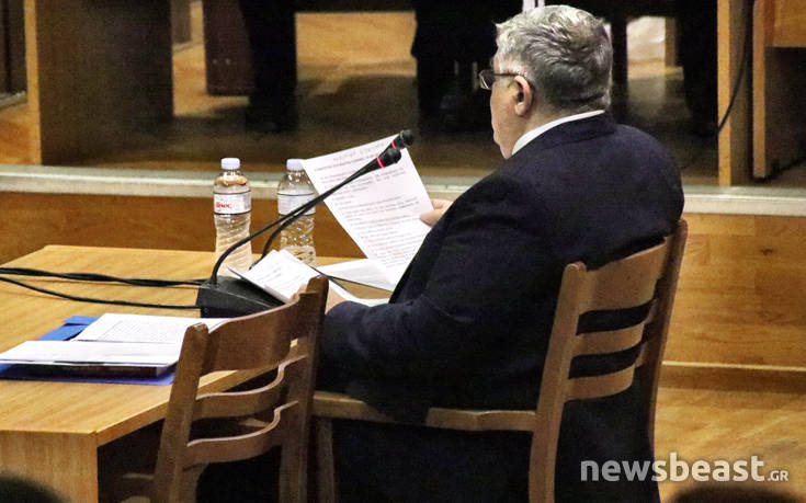 «Θέλω να δηλώσω αθώος από τις κατηγορίες μου αποδίδονται κατόπιν πολιτικής σκευωρίας 25 ετών. Δεν είναι δυνατόν να υπάρχουν παρεμβάσεις στη Δικαιοσύνη. Το έχω καταγγείλει και στη Βουλή. Δεν θα έπρεπε η ηγεσία να ορίζεται από εκάστοτε Κυβέρνηση. Για πρώτη φορά στη πολιτική ιστορία Ελλάδος κάθεται στο εδώλιο ένας αρχηγός για πράξη ενός οπαδού κόμματος» είπε ξεκινώντας την απολογία του.