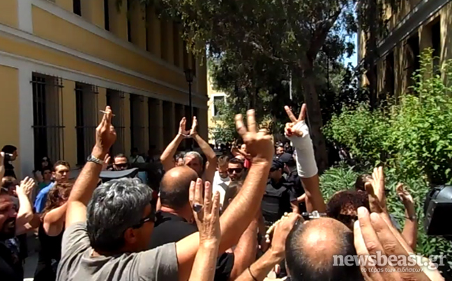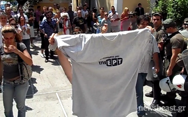 Εκτός από τα συνθήματα που φωνάζουν, μία διαδηλώτρια έβγαλε τη μπλούζα της η οποία ανέφερε: «Το αγαπημένο μου… της ΕΡΤ».