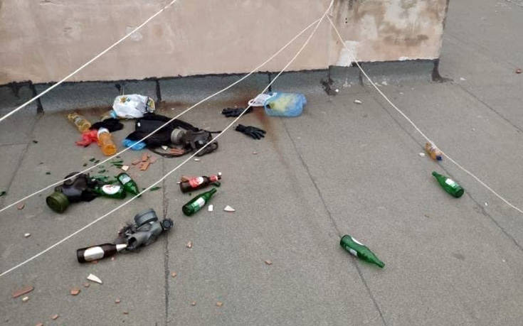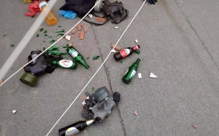 Οι συλληφθέντες, σύμφωνα με την αστυνομία, βρίσκονταν σε δώμα της ταράτσας της πολυκατοικίας όπου βρέθηκαν και κατασχέθηκαν, όπως βλέπετε στις φωτογραφίες, βόμβες μολότωφ, γάντια, αντιασφυξιογόνες μάσκες, πέτρες και άλλα αντικείμενα.
