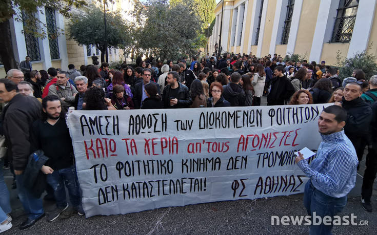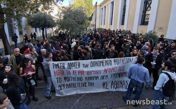«Άμεση αθώωση των διωκόμενων φοιτητών», αναγράφεται, μεταξύ άλλων, σε ένα μεγάλο πανό που κρατούν οι συγκεντρωμένοι, ενώ ισχυρές δυνάμεις των ΜΑΤ βρίσκονται μέσα και έξω από το κτίριο όπου εκδικάζονται οι υποθέσεις των φοιτητών.