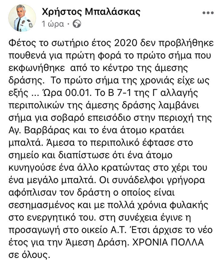 Αντιδράσεις προκάλεσε μία δημοσίευση του συνδικαλιστή της ΕΛΑΣ, Χρήστου Μπαλάσκα, ο οποίος αναφέρθηκε στην πρώτη κλήση του 100 για το 2020… «ανεβάζοντας» και φωτογραφίες από το περιστατικό στο προφίλ του στο facebook.