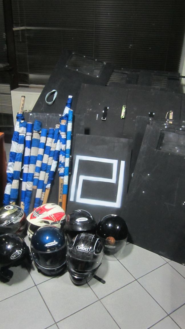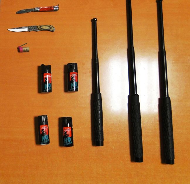 Σε σωματική τους έρευνα βρέθηκαν να κατέχουν, ο 25χρονος ένα δακρυγόνο σπρέι και μια πτυσσόμενη ράβδο (γκλομπ), ο 39χρονος δακρυγόνο σπρέι, ο 17χρονος μια πτυσσόμενη μεταλλική ράβδο (γκλομπ), ο 22χρονος ένα δακρυγόνο, μια πτυσσόμενη μεταλλική ράβδο (γκλομπ) και ένα (1) σουγιά και ο 20χρονος ένα δακρυγόνο σπρέι, ένα ( σουγιά και μια κροτίδα. Και οι πέντε δήλωσαν ότι είναι μέλη του συγκεκριμένου πολιτικού κόμματος.
