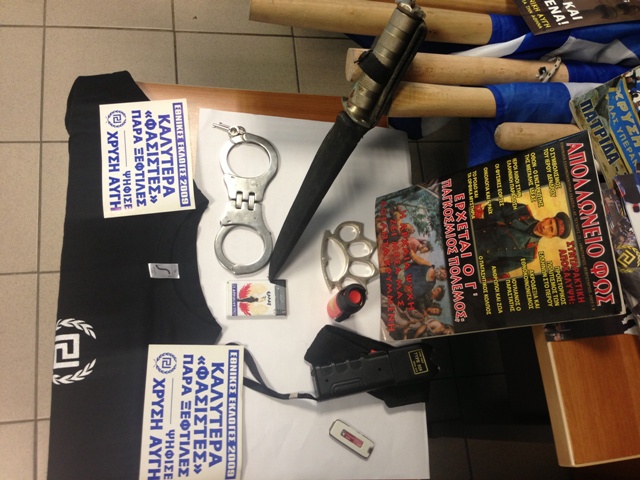 Ειδικότερα, στο πλαίσιο έρευνας, που πραγματοποιήθηκε σε γραφείο που διατηρεί η τοπική οργάνωση του πολιτικού κόμματος «Λαϊκός Σύνδεσμος – Χρυσή Αυγή», στο Ηράκλειο, παρουσία Εισαγγελικού Λειτουργού, βρέθηκαν μαχαίρι με μήκος λάμας 20 εκατοστών, ξύλινη ράβδος (κοντάρι) και σφυρί.
