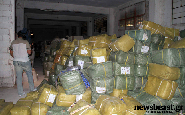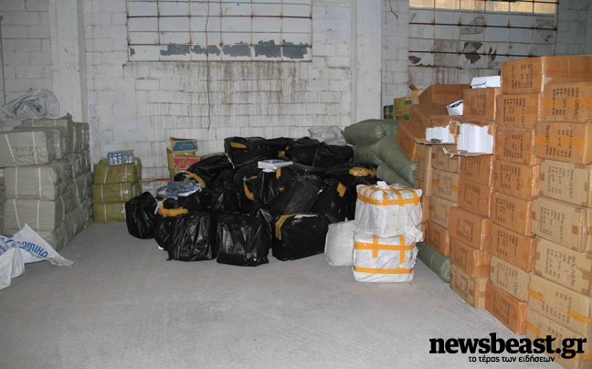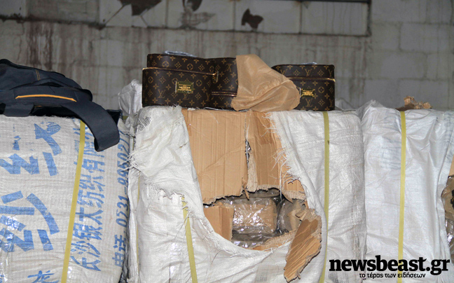 Η αποθήκη, που εδώ και ένα χρόνο ήταν άδεια, άρχισε την τελευταία εβδομάδα να γεμίζει με τόνους «μαϊμού» εμπορευμάτων (γυαλιά, τσάντες, ρολόγια, ρούχα) τα οποία ξεφόρτωναν καθημερινά νταλίκες.