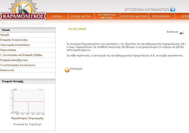 Σε συνέχεια δημοσιευμάτων που εμπλέκουν τον ιδιοκτήτη της Αρτοβιομηχανίας Καραμολέγκος A.E., κ. Εμμ. Καραμολέγκο, σε υπόθεση απαγωγής, θα θέλαμε να ενημερώσουμε ότι υπάρχει σε εξέλιξη αστυνομική έρευνα.