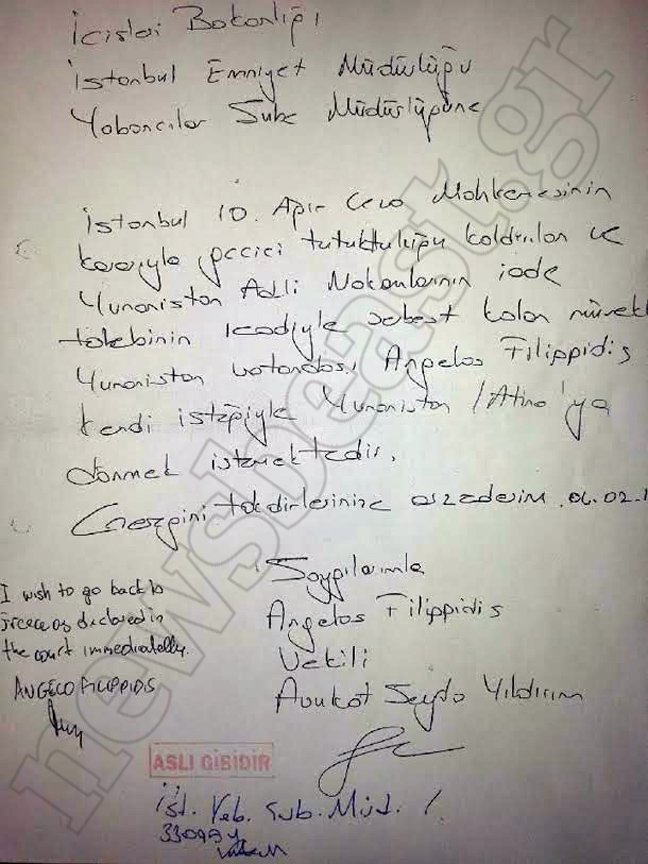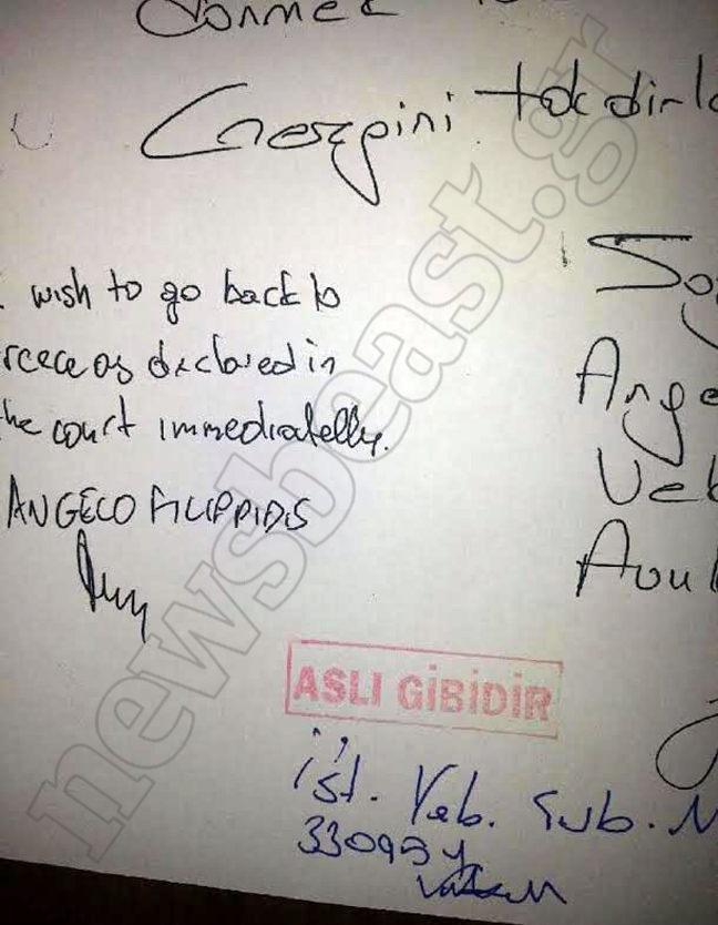 Το έγγραφο που παρέδωσε στις τουρκικές Αρχές στην Κωνσταντινούπολη ο Άγγελος Φιλιππίδης με το οποίο δήλωσε την επιθυμία του να επιστρέψει στην Ελλάδα σάς παρουσιάζει το newsbeast.gr.