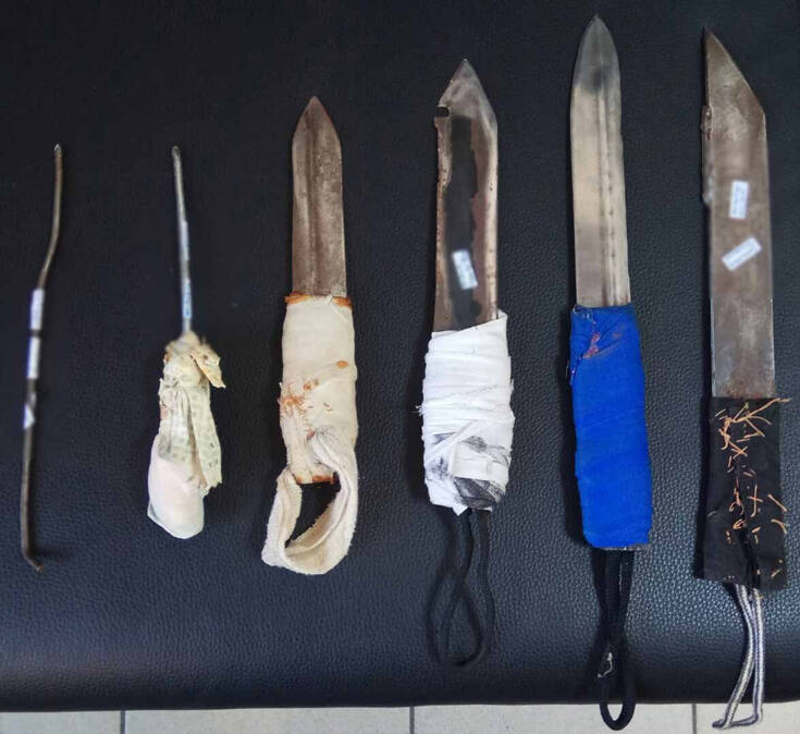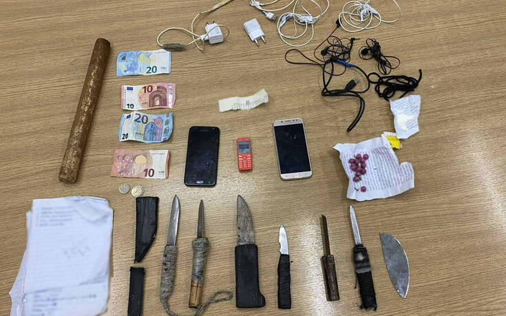 μικροποσότητα κατεργασμένης κάνναβης (σε μορφή σοκολάτας), - (6) αυτοσχέδια μαχαίρια,