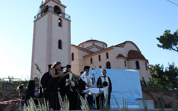 Λίγο μετά τις 7 το απόγευμα πραγματοποιήθηκαν τα αποκαλυπτήρια του μνημείου των θυμάτων της πυρκαγιάς που φιλοτέχνησε ο γλύπτης, Κώστας Ανανίδας και βρίσκεται στον προαύλιο χώρο της εκκλησίας.