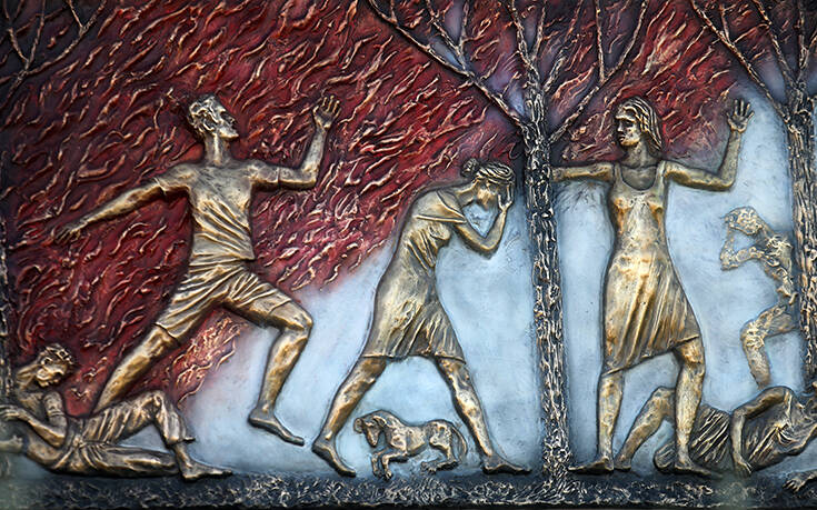 Έπειτα αποκαλύφθηκε το μνημείο, στο οποίο απεικονίζεται η προσπάθεια των ανθρώπων να σωθούν τρέχοντας, ενώ πίσω τους ακολουθούσε η φωτιά.