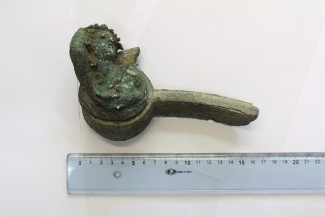 -Ένα (1) τμήμα χάλκινης επένδυσης επίπλου, πιθανώς προερχόμενη από ανάκλιντρο ή κλίνη, με ολόγλυφη προτομή αγένειου Διονύσου, κισσοστεφούς που κρατά κάνθαρο και φέρει ένθετο διάδημα από διαφορετικό μέταλλο, διαστάσεων 0,15μ. Χ 0,10μ. Χ 0,055μ. , πιθανώς Ελληνιστικής εποχής.