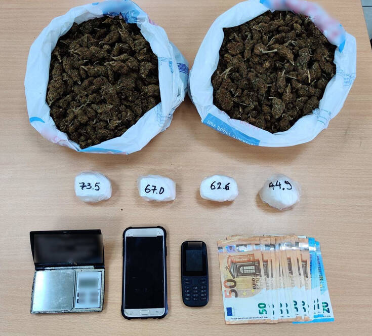 Σύμφωνα με την Αστυνομία, οι αστυνομικοί εντόπισαν στο οικόπεδο του σπιτιού του, μέσα σε θαμνώδη βλάστηση και κάτω από αγριόχορτα, περίπου δύο κιλά κάνναβης και 248 γραμμάρια κοκαΐνης.